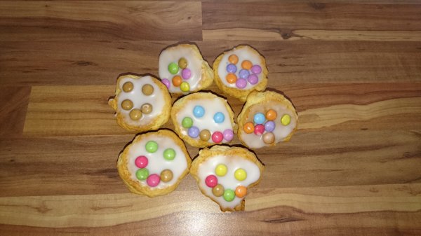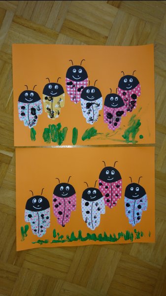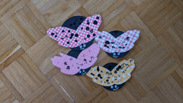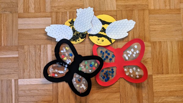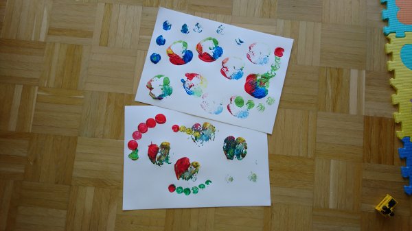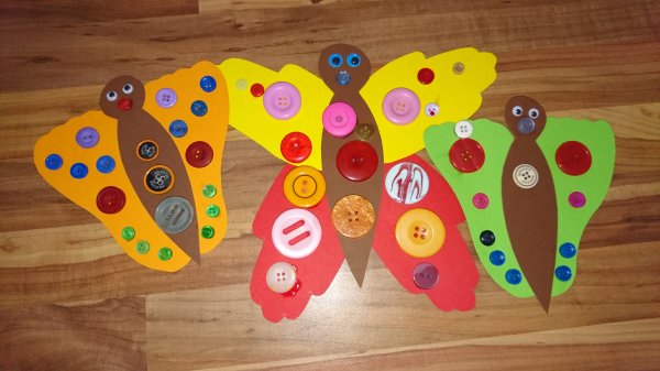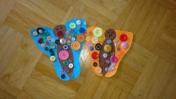 Außerdem spielen wir noch ganz viele Spiele und basteln Schmetterlinge aus Hand- und Fußabdrücken, die wir dann mit bunten Knöpfen bekleben. Das macht richtig Spaß! Und wir backen ganz viel, das ist auch sehr cool!