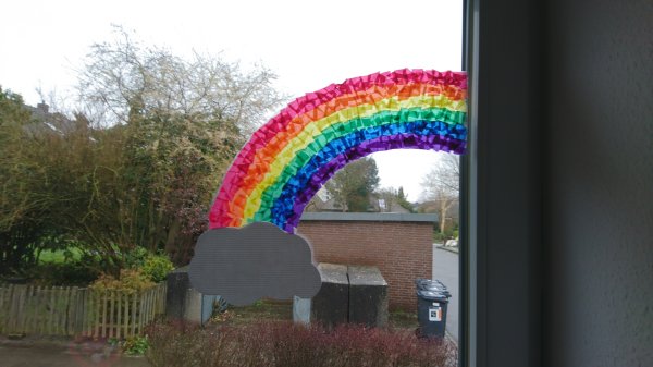 In der WhatsApp-Gruppe von Niklas' Kindergarten-Gruppe ruft eine Mami auf, dass alle einen Regenbogen malen und ins Fenster kleben sollen. Wir basteln einen aus Transparentpapier-Schnipseln. So können die Jungs erst schneiden und dann kleben, klasse!