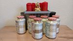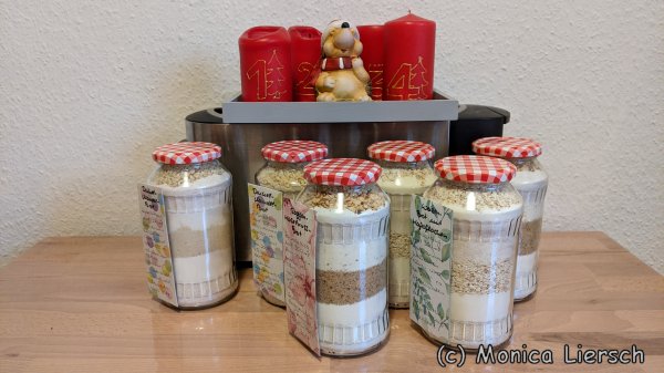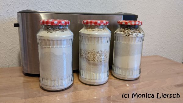 Das Mehl mit der Hefe und dem Salz in ein großes Glas schichten. Zum Beispiel 100 g Vollkornmehl, 100 g Weizenmehl, Salz, gemahlene Mandeln, Hefe, 100 g Weizenmehl, 100 g Vollkornmehl. Dann das Glas bis oben mit den gehackten Nüssen auffüllen und verschließen.