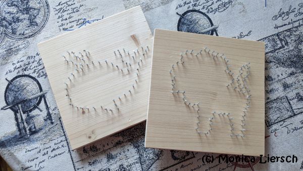 Niklas hat uns jetzt so lange in den Ohren gelegen, dass er hämmern möchte, dass ich jetzt endlich Vorlagen für Fadenbilder herausgesucht habe. So können die Kids endlich mal ein paar Nägel einschlagen.