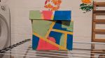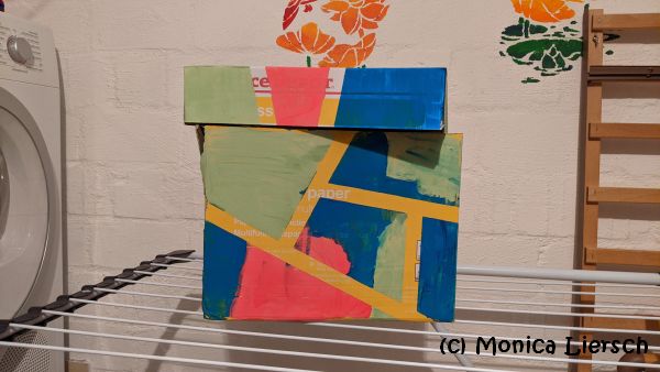 Den Karton mit Malerkrepp bekleben, sodass abgegrenzte Flächen der gewünschten Größe entstehen. Nun den Karton anmalen, ganz nach Belieben.